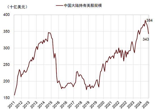 新货币秩序下人民币资产相对受益。新货币秩序下,美元步入下行周期,美债作为安全资产不再“安全”,全球投资者对美债需求下降,利率中枢可能结构性上行,意味着美债利率对非美市场定价的“锚”作用下降(图表5),高利率对人民币资产的压制作用也可能减弱。如果以美债收益率计算股权风险溢价,目前A股和港股的风险溢价都在历史低位,但如果美债不再是定价锚,那么中国股票在定价方面的压力将大幅缓解,若以国债收益率计算股权风险溢价,当前A股和港股的估值仍然具备较强的吸引力(图表6)。而且我们认为如果政策应对得当,人民币资产有望受益于全球货币体系加速碎片化、多元化的双重红利:碎片化加速中国在海外的资金回流,根据美国财政部数据,截至2025年一季度,中国大陆持有美股3400亿美元(图表7);多元化驱动全球资金再平衡,或有部分资金回流中国资本市场,港股作为离岸人民币资产有望直接受益。随着内资对港股的影响力上升,A股和港股相关系数持续上升至历史高位,AH溢价也处于近5年低位,如果港股价值重估,也将对A股有较强的外溢效应(图表8)。要注意在国际货币秩序重构之下,格局转换和资金流动的力量将远大于一时、一市场和一个国家基本面的变化。