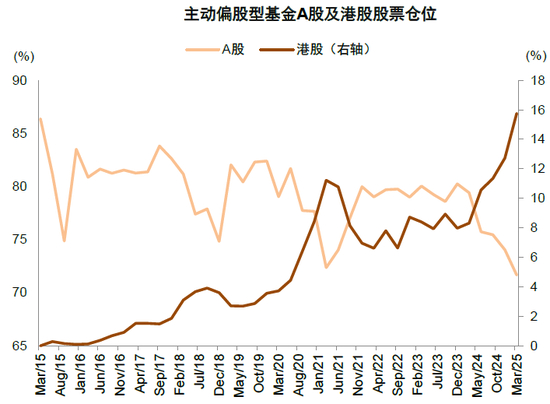 图表23:主动偏股型公募基金的A股仓位降至近十年新低水平