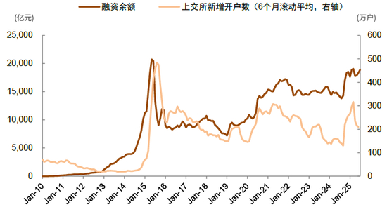 增量资金入市带来个人投资者交易及市值占比阶段性回升。2016年-2021年,在国内经济重回再通胀、企业盈利进入上行周期,以及产业升级和消费升级等趋势的驱动下,A股的蓝筹板块上涨与机构资金流入形成共振,公募、私募和外资等市场化机构投资者占A股持股比例不断提升。我们测算这三类机构持股占A股自由流通市值合计由2015年的14%左右,上升至2021年约32%,机构投资者合计占比由39%提升至接近50%。(图表9)2022年以来,在国内房地产周期下行,供需失衡带来物价下降压力,以及外部地缘风险上升等因素共同作用下,A股市场尤其是蓝筹股回调较多,前期“机构化”进程阶段性放缓,尤其是2024年以来资金南下港股,以及去年“924”之后个人投资者快速入市,2024年我们测算的机构投资者占比出现回落,从2023年的49.1%下降至2024年的46%,基本回到2018年之前的水平。其中我们估算的公募、私募和外资占比由32%降至24%(不含汇金持有ETF),若进一步剔除个人投资者持有的股票ETF,该比值进一步下降至22%,同口径下较2021年下降约10个百分点(图表10)。与此同时,我们测算个人投资者占比由2021年的50.5%反弹至2024年54%,若包含个人投资者持有股票ETF,则提升幅度接近5个百分点。相关印证还包括2024年10月以来上交所月均新增开户数268万户,相比2024年前9个月环比增长80%,市场的融资余额近半年也维持在1.8万亿元之上(图表11)。