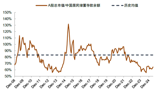 A股市场规模相比货币供应量、储蓄存款的比值仍处于历史偏低位。类似于巴菲特采用总市值/GDP来衡量市场估值,我们认为从资金面视角,采用股票市值与货币供应量或者储蓄存款的比值,也具有一定的估值意义。货币供应量增长往往通过信贷传导至实体,对于经济基本面和企业盈利具有一定的前瞻效果,也体现了M2和股票市场的关联;储蓄存款是M2中的重要构成,并且是权益市场资金的潜在来源,用股票市场的总市值/M2和总市值/储蓄存款,对于衡量市场合理规模有一定参考意义。历史上这两个指标呈现区间围绕均值波动的特征,当前A股总市值/M2为31.7%,位于历史35%分位左右,总市值/储蓄存款仅为64.6%,仅略高于历史最低水平(图表18-19)。
