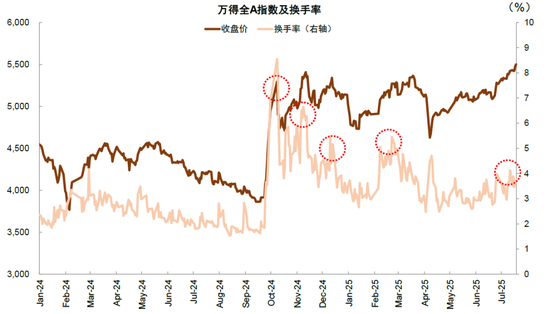图表1:指数走强突破新高,但换手率水平不及前期高点