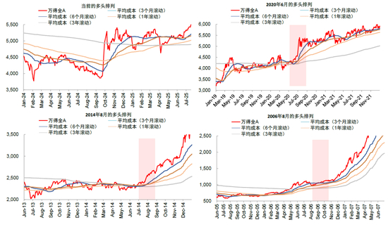 市场指数与成本曲线的位置,可以一定程度上刻画资金筹码结构和赚钱效应。当前居民资产具备配置加码权益市场的条件,但是否增配仍受风险偏好等方面影响。我们在去年10月发布的《低位放量大涨历史复盘与配置启示》[2]中,提出构造不同期限投资者的成本指数(3个月、6个月、1年、3年),根据市场点位与不同成本曲线对比来衡量赚钱效应。通常而言期限短的投资者通常相比期限长的投资者更不稳定,盈利时更容易止盈,亏损时更容易止损。因此理想状态下,当市场指数突破所有短中长期成本曲线,且所有短期成本曲线高于长期成本曲线(类似于技术分析中的“多头排列”),代表早期入场的投资者成本更低且获利更丰厚,新入场投资者承担了更高的成本并且也实现获利,是资金筹码结构较好的状态(图表20)。历史上2006年下半年,2014年下半年以及2020年年中均出现类似情形,后续市场呈现为增量资金流入与市场上涨共振的状态。
