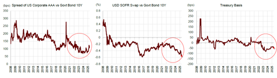 注:1)参考文献Szoke等(2024)、 Krishnamurthy和Vissing-Jorgensen(2012)、 Du等(2023)、Schnabel(2024)、Obstfeld和Zhou(2023)。2)右图Treasury Basis为3个月期美债利率相对于8种外币( CAD, CHF, DKK, EUR, GBP, JPY, NOK 和 SEK )CIP条件的差值的均值,即其中,  和分别为3个月外币国债和美债收益率, 和分别为即期和3月期远期汇率。3)图中均为10日均值线