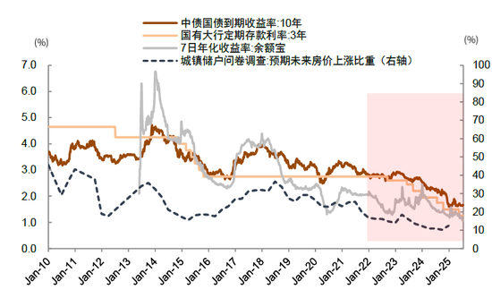 居民储蓄存款积累的同时,可配置的高收益资产相对稀缺。2022年-2024年我国居民新增存款48.8万亿元,储蓄存款余额累计增长47.6%,增速明显高于名义GDP增长,或与消费支出放缓和购房需求下降有关。2025年上半年居民存款同比再度大幅增长,储蓄存款余额已突破162万亿元(图表13)。与此同时,当前又处于典型的“资产荒”环境(图表14),十年期国债收益率下探1.6%,国有大行的3年期定期存款利率降至1.25%,各类高收益资产在过去三年逐渐“消失”。在此背景下,我们认为居民对于适度高回报的权益资产配置需求有望继续提升,去年“924”行情快速提振场外资金情绪是证据。