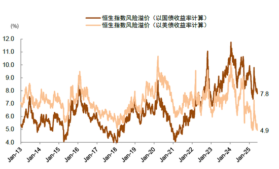 图表6:以美债收益率计算的港股风险溢价处于历史低位,但国债收益率计算的风险溢价仍高于历史均值