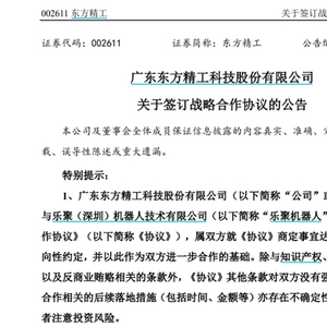 7月21日,东方精工发布公告称,公司与乐聚机器人签署了《战略合作协议》。双方本着友好合作、互利互惠、共同发展的原则,建立战略合作伙伴关系,聚焦具身智能机器人方向,在生产制造、场景拓展、业务推广等方面开展战略合作。