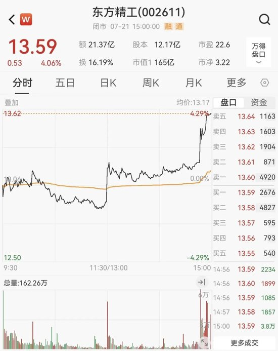 7月21日,东方精工股价盘中异动,尾盘直线拉升,截至收盘,该股报13.59元/股,总市值为165亿元。