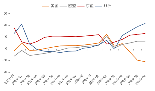 从月度增速看,对等关税生效前对美抢出口(3月份对美出口同比增长9.1%,4、5月分别下降21%、34.5%),豁免期内对美抢出口(6月份对美出口降幅比5月份收窄18.4个百分点),美与各国达成关税协议前抢转口(4月以来对东盟出口持续较快增长)。