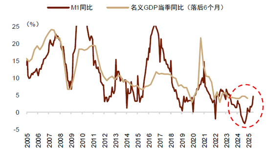 图表7:M1同比增速领先名义GDP增速6个月左右,M1拐点上行后最终会转化为增长动能