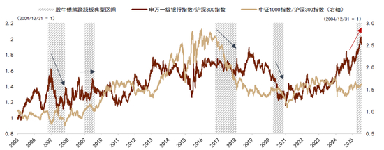 图表2:典型“股牛债熊跷跷板”行情中银行与小盘股常常跑输大盘,本轮“跷跷板”行情银行股与小盘股双双跑赢