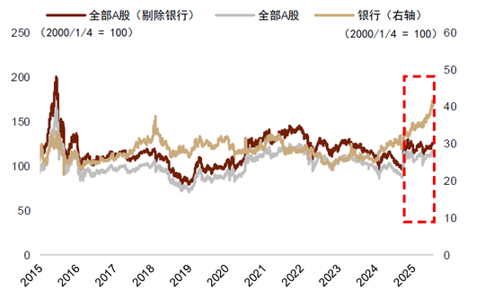 注:“全部A股”指数采用沪深北三地交易所全部上市A股标的,基于各成分股的自由流通市值进行加权计算得出;类似地,“银行”和“全部A股(剔除银行)”指数分别采用所有银行行业标的、剔除银行的全部A股标的,以自由流通市值加权计算得到
