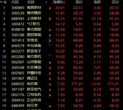 上纬新材带动下,A股市场机器人概念股集体走强,其中,海昌新材20cm涨停,国投智能一度涨19%,中化装备、新亚电子、南方路机10cm涨停,利元亨、祥鑫科技、上海电气、德迈仕、江特电机、欧圣电气、优德精密等跟涨。