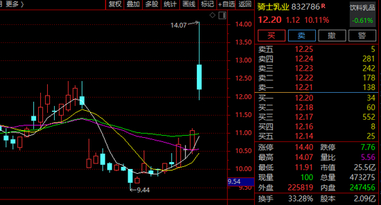 其中,骑士乳业盘中一度涨超26%,西部牧业一度涨超13%,但随后双双涨幅均大幅缩窄。贝因美、熊猫乳品、嘉必优、均瑶健康、三元股份、皇氏集团、光明乳业均高开低走。