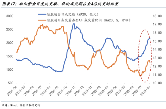 散户交易火热的同时,沉寂许久的外资也在逐步回归。7月北向资金日均成交额2024亿元,较6月大增36.3%,也是自924 行情以来首度出现日均成交额与成交占比同时上升的情形(以20日移动均值视角来看),这说明本轮外资回暖的“自发性”更强。(图17、图18、图19)