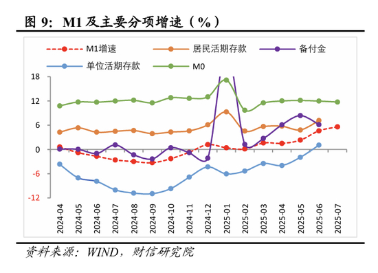 7月M1增速为5.6%(见图8),较上月提高1.0个百分点,连续三个月明显回升,原因主要有三:一是低基数的支撑,如2024年7月M1增速仅为-2.6%,且较上月回落0.9个百分点;二是受权益市场赚钱效应提升和居民预期有所改善等因素影响,居民存款或明显活化;三是受益于多地加快发行专项债券偿还拖欠企业账款和人民币汇率升值预期下结售汇需求增加,企业活期存款增速或提升较多。尽管本月M1细项数据暂未公布(见图9),但剔除M0外的(居民活期存款+企业活期存款+备付金)三项合计规模增速,较上月提高1.1个百分点,也侧面印证居民、企业活期存款增加是M1回升的重要原因。