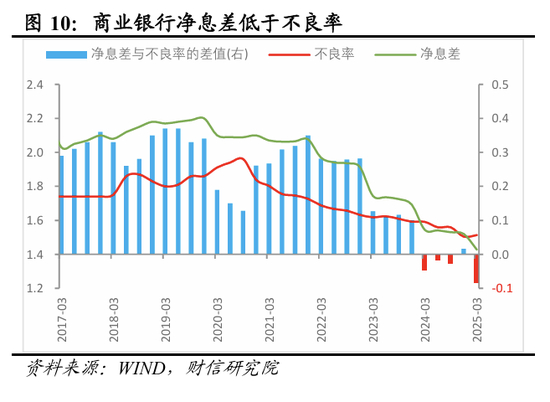 一是随着实体资金明显活化、物价增速尤其是核心CPI增速趋于回升,短期央行进一步宽松的意愿下降。二是货币宽松仍面临较大的稳息差(2025年一季度商业银行净息差降至1.43%,已不足以覆盖同期1.51%的不良贷款率,见图10)、政策效用下降等制约,近期出台的个人消费贷款和服务业经营主体贷款财政贴息政策,有利于缓解银行息差压力、提高其放贷积极性,并刺激信贷需求,但实际效果仍有待观察。三是信贷数据反映出国内需求不足根本矛盾尚未缓解,下半年尤其是四季度经济走弱压力不容忽视,仍不排除四季度根据经济形势变化、配合其他政策和改革举措,再度降准、降息的可能性。
