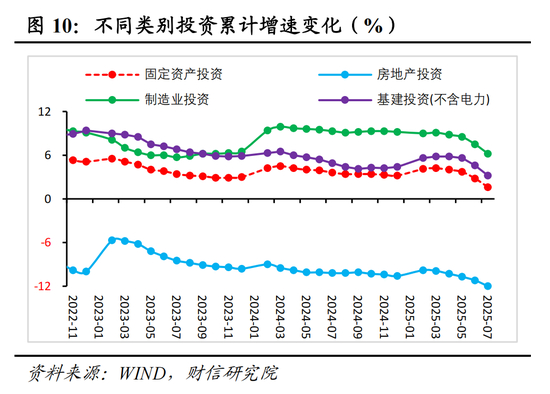 1-7月份制造业投资同比增长6.2%,较1-6月份放缓1.3个百分点;倒推的当月同比增速为-0.3%,较6月份回落5.3个百分点,破除“内卷”、内需全面回落、出口下行预期增强以及政策效应减弱均形成拖累。具体看:其一,随着7月初中央财经委将“反内卷”上升为国家战略,水泥、光伏、钢铁、汽车等行业积极响应,主动压降资本开支,短期对制造业投资增速形成拖累;但中长期看,破除内卷将引导竞争回归效率与创新,从而提振物价与企业盈利,畅通国内大循环并扩大有效投资。其二,受内需走弱、外需下降预期增强以及政策效应减弱共同影响,本月上中下游制造业投资增速均有所回落。其中,上游原材料行业受基建地产需求走弱影响,投资增速下降尤为明显;中游装备制造业投资增速多数回落,计算机通信、电气机械等受政策和出口支撑较强行业回落更多;下游消费品制造业回落幅度相对较小,未来随着国内大循环的畅通,有望继续维持较高增长(见图11)。其三,1-7月份设备工器具购置投资累计同比增长15.2%,较上月回落2.1个百分点,继续对投资增速形成支撑,但支撑作用明显走弱。