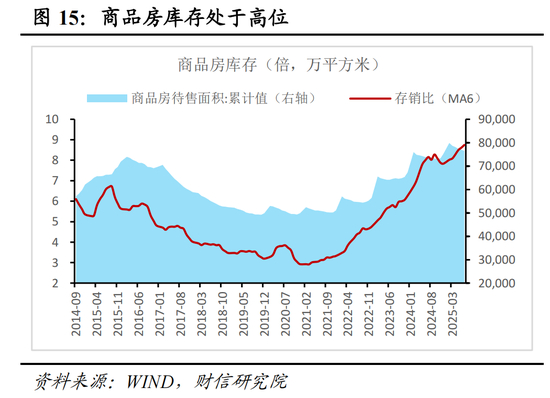 领先指标预示投资增速处于筑底阶段。一是房企融资压力有所加大,如2025年7月房地产资金来源累计同比下降7.5%,降幅较6月份扩大1.3个百分点,虽然有去年基数走高的影响,但也显示出房企融资压力加大。其中,国内贷款增速两个月为正,显示出“白名单”等政策对房企的支持较为有力;但居民购房速度放缓,拖累房企融资,导致定金及预收款增速下降较多。二是民营房企拿地意愿仍较弱,如1-7月100个大中城市、一线、二线、三线城市成交土地面积增速分别为-8.4%、-14.3%、-0.8%、-11.7%,较6月分别下降0.9、10.2、1.5、0.2个百分点,显示出房企购地能力和意愿低。三是作为房地产投资领先指标的房地产销售面积降幅继续扩大,预示未来房地产投资增速继续筑底调整的可能性较大,企稳需政策力度进一步加大。