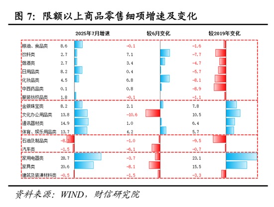 一是汽车消费拖累显著。受多地国补暂时暂停、6月车企年中冲量透支需求等因素影响,7月汽车类商品零售额增速较上月回落6.1个百分点,对社零的拉动较上月降低约0.7个百分点(见图6-7),贡献了社零全部降幅的六成左右。二是以旧换新政策带动作用继续放缓。7月份限额以上单位家用电器类、家具类、文化办公用品类、通讯器材类、建筑装潢类商品零售额分别增长28.7%、20.6%、13.8%、14.9%、-0.5%,除通讯器材外,增速均较上月有所回落,五者合计拉动社零增长1.0个百分点,比上月回落0.5个百分点(见图6-7)。三是餐饮收入持续低迷。受整治违规吃喝,京东、美团等外卖平台继续低价补贴等因素影响,7月份餐饮收入增速仅增长1.1%,对社零的拉动较年初明显下降(见图6-7)。四是中低收入群体消费继续温和回落。7月份代表中低收入群体消费的限额以下商品零售增速,较上月继续小幅回落,对社零的拉动较上月降低约0.1个百分点(见图6)。