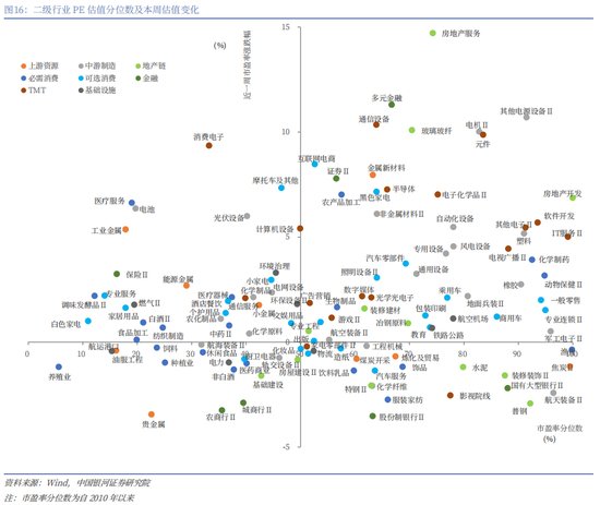 从行业层面来看,本周31个一级行业中,21个行业市盈率估值上涨。截至8月15日,从市盈率估值来看,共有18个行业估值高于2010年以来50%分位数,有10个行业的估值处于2010年以来20%-50%分位数区间,另外2个行业估值低于2010年以来20%分位数水平。其中,房地产、计算机、商贸零售的PE估值分位数较高,分别处于2010年以来99.97%、96.07%、85.08%分位数水平;农林牧渔、食品饮料、有色金属的PE估值分位数较低,分别处于2010年以来5.64%、16.16%、20.51%分位数水平。