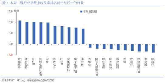 二级行业表现来看,本周收益率前五的行业依次是玻璃玻纤、通信设备、电机Ⅱ、其他电源设备Ⅱ、元件;收益率靠后的行业依次是城商行Ⅱ、贵金属、股份制银行Ⅱ、农商行Ⅱ、普钢。