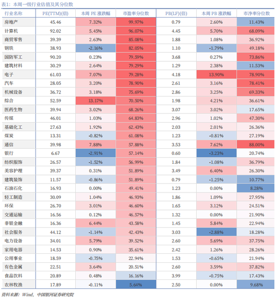 从行业来看,本周一级行业多数录得上涨。科技股表现明显回暖,市场成交活跃带动非银金融板块行情,涨幅靠前的三个行业分别为通信、电子、非银金融,涨幅分别为7.66%、7.02%、6.48%。而银行、钢铁、纺织服饰跌幅靠前。