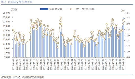 配置方面,市场成交活跃状态下,市场有望围绕AI产业链、反内卷、非银金融等板块轮动。在中报集中披露期,结合业绩预告情况,重点关注上游的有色金属行业,中游的钢铁、机械设备、电力设备行业,以及非银金融、农林牧渔、电子等行业的配置机会。主题方面,重点关注以下领域:(1)科技成长板块。AI技术革命与新兴产业趋势催化下,成长板块有望展现出较高景气度。算力概念、AI应用、机器人方向等仍将处于反复活跃状态之中。后续在九三阅兵、“十五五”规划布局预期下,国防军工行业有进一步上涨空间。(2)反内卷概念。和上一轮供给侧结构性改革相比,本轮反内卷不仅仅是钢铁、水泥等传统领域,还涉及光伏、锂电、新能源汽车等新兴产业。近期来看,8月的光伏组件市场再现缺货与涨价现象,在“反内卷”政策推动下,玻璃纤维落后产能持续出清。随着更多积极信号释放,投资者聚焦中长期视角下供需格局改善与行业盈利修复,反内卷概念仍将是贯穿市场行情的主题。(3)安全边际较高的资产。随着市场风险偏好大幅抬升,高股息板块出现短期调整,但在海外不确定性叠加、国内无风险利率下行、中长期资金入市的环境下,中长期配置逻辑依然清晰,建议关注调整后的配置机会。(4)政策提振下的大消费板块。随着外部环境不确定性持续,扩大内需成为长期战略之举,提振消费的重要性凸显。7月中央政治局会议强调在扩大商品消费的同时,培育服务消费新的增长点