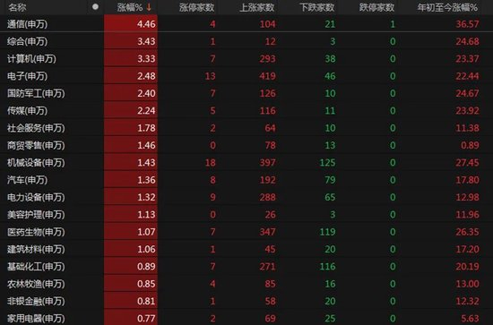 31个申万一级行业中,仅石油石化、房地产板块微跌。14个板块涨幅超过1%,通信板块以4.46%涨幅领先全场,德科立、锐捷网络、剑桥科技、东信和平涨停;综合、计算机板块涨幅超过3%,亚泰集团涨停,科创信息、大智慧、淳中科技、华胜天成、中科金财、智微智能、中安科也纷纷涨停。