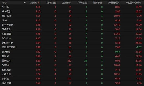 Kimi概念、时空大数据、东数西算、财税数字化、注册制次新股、智谱AI、国产软件、影视概念也大涨。
