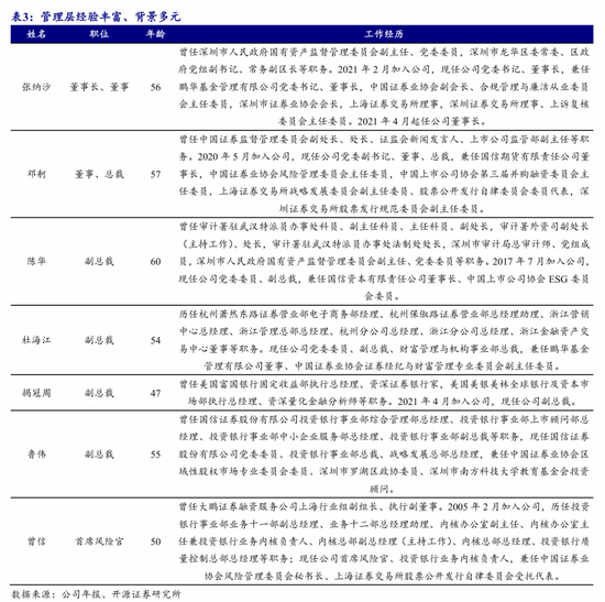 管理层经验丰富、背景多元。公司管理层背景多元,具有专业的金融机构管理经验。现任董事长张纳沙2021年4月任职,张纳沙曾任深圳市人民政府国有资产监督管理委员会副主任、党委委员,深圳市龙华区委常委、区政府党组副书记、常务副区长等职务。董事、总裁邓舸曾任中国证券监督管理委员会副处长、处长、证监会新闻发言人、上市公司监管部副主任等职务。