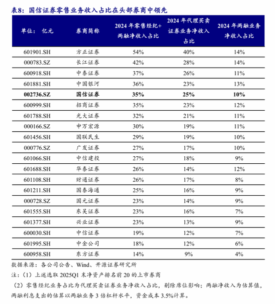 公司零售经纪服务能力强:(1)打造财富管理品牌:公司拥有专业的投顾服务、丰富的产品体系、智能化系统平台不断满足居民多元化、个性化的财富管理需求。公司建设总部投顾服务团队,依靠全国239家分支机构近3700名一线精英投资顾问,打造“总部标准化触达+分支个性化服务”的服务体系。公司“国信鑫投顾”、“国信鑫汇盈”等投顾品牌客户覆盖率进一步提升;“国信鑫私享”高端财富管理品牌综合服务谱系形成,满足客户定制化需求;创新推出“国信鑫享传承”家庭服务信托品牌,满足家庭财富保值、增值、传承等场景需求。同时,公司持续扩大资讯和工具类投顾产品供给,通过持续输出投资建议及多样投顾策略,全面优化客户投资体验。(2)为机构和高净值客户提供“一站式”综合金融服务:面向机构和高净值客户,国信证券提供定制化综合金融服务,串联起财富管理、资产管理、投资银行服务链条,实现“全价值链财富管理”。升级“GTrade+”私募机构综合服务品牌,持续优化量化私募交易体验,形成了以交易为核心的策略交易、智能算法等综合交易解决方案;打造“国信企明星+”企业综合金融服务品牌,为上市公司及公司高管、股东、员工等提供股权激励全流程管理、股份交易合规管控等智能化、专业化的综合服务,助力实体经济走深走实;上线国信“机构通”基金投资交易服务平台,机构综合服务水平进一步增强。