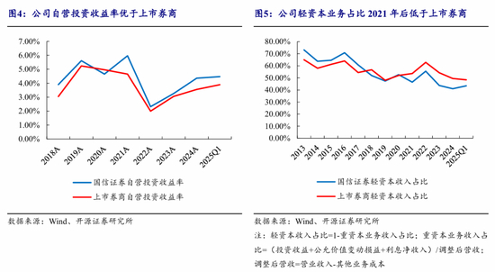 经纪及自营投资为核心收入贡献来源,ROE高于上市券商,内生盈利能力强而非杠杆驱动。公司收入结构来看,经纪和自营是公司核心业务,2024年占比分别为30%/51%。公司ROE水平均高于上市券商,杠杆水平持续低于上市券商,反映ROA水平高于行业,自营投资收益率持续高于上市券商,重资本业务收入非杠杆驱动,而是内生盈利能力强。