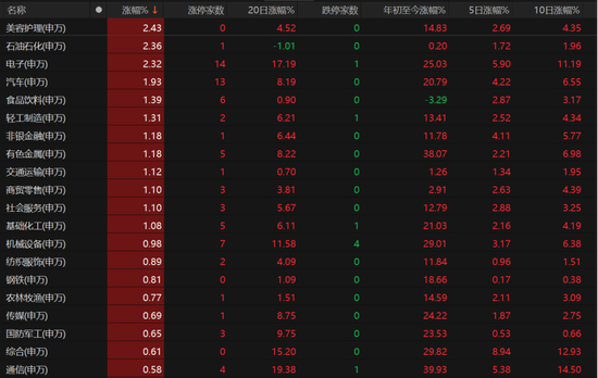 31个申万一级行业板块中,仅医药生物板块微跌,其余收涨。其中,美容护理、石油石化、电子板块涨幅均超过2%。汽车、食品饮料、轻工制造、非银金融、有色金属等板块也表现突出,酒鬼酒、会稽山、一鸣食品涨停,罗平锌电、创新新材、东方锆业、金田股份、云南锗业涨停。