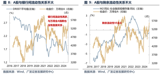 如果银行间流动性紧会导致股市流动性紧的关系成立,那么,SHIBOR从2018年开始持续走低,但是A股为什么没有持续走牛?实际上,银行间流动性对股市的影响微乎其微。原因在于,银行间流动性再多,资金都没法直接流入股市,银行间流动性主要流向货币和汇率市场,包括购买债券、票据等,从数据结果上看,银行间流动性与创业板指和A股没有直接关系;M2-社融形容的剩余流动性对创业板指的指引意义也不大,因为钱再多,也可能没法流入权益市场。同样的,美股与银行间流动性关系也不大,历史上LIBOR/SOFR和纳斯达克指数的相关性不大。