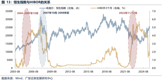 同理,HIBOR突然抬升,也不一定会导致港股崩盘,例如2022年11-12月HIBOR继续冲高至5%以上,但随着中国大陆防疫政策的放松,经济预期开始好转,股指在10月末已经见底回升了。例如2004年初-2007年10月,HIBOR从0.15%提升至5.4%,恒生指数也一路创新高甚至突破31000点。