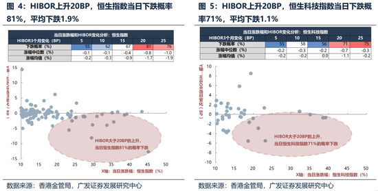 市场常担心HIBOR的快速上升,会导致港股的下跌,并非毫无道理。从实证分析来看,历次HIBOR上升20BP,恒生指数当日下跌概率81%,中位数下跌0.8%。但是均值下跌1.9%;恒生科技指数当日下跌概率71%,中位数下跌0.7%,但是均值下跌1.1%。下跌幅度的均值远大于中位数,代表尾部较长,数据中存在较大的极端值。换句话说,就是过往HIBOR快速上升,港股当日走势下跌概率很大,并且还存在令投资者印象深刻的几次暴跌。