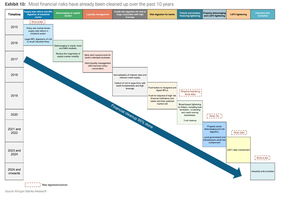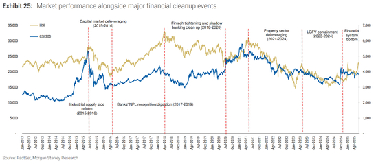 摩根士丹利分析师指出,经过十年的金融清理工作,高风险金融资产已从2017年的62万亿元人民币(占金融资产总额的30.2%)大幅降至2025年的21万亿元人民币(占比4.9%)。