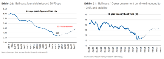 在牛市情形下,大摩预测市场化的金融体系应能推动贷款和金融资产收益率在3—4年内回升50-70个基点,支持金融企业7-8%的收入增长和双位数利润增长,在几年内超过名义GDP增长,然后重新与GDP增长保持一致。