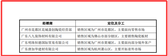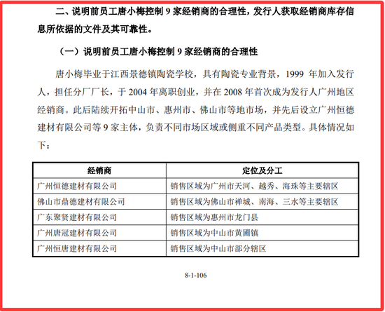其中“广州恒德建材有限公司等9家经销商是前员工唐小梅所控制”,并明确标注从“2008年合作至今”。