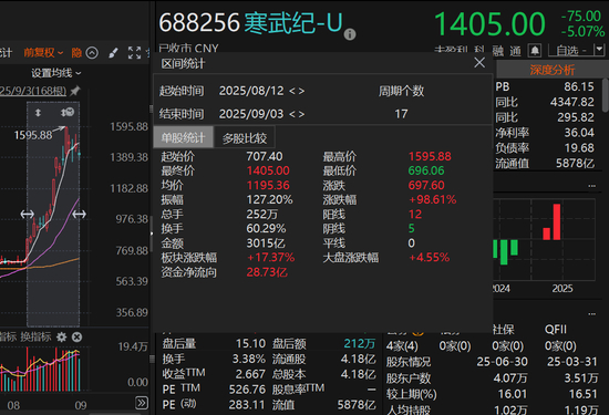 从三季度以来市场走势看,寒武纪区间最高涨幅接近两倍,这也是其在科创50指数中权重飙升的重要原因。从寒武纪近期量价情况看,8月12日至9月3日,短短17个交易日,成交总额高达3015亿元,日均成交额高达177亿元。