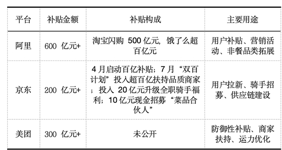 根据媒体报道及各家已经披露的补贴数据,为了这场外卖竞争,三家平台将至少直接投入累计超1000亿元真金白银的补贴。