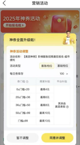面对平台的规则,商家几乎没有议价权。在上海郊区经营小吃店的吴从发现,她没法退出任何一个活动。京东平台会自动为商家叠加新客增加补贴1元的活动,自营商家无法在后台自行退出。在美团,所有优惠活动捆绑成一个“神券活动包”,商家要么全部参与,要么全部退出,而一旦退出,店铺的流量和曝光都会受影响。