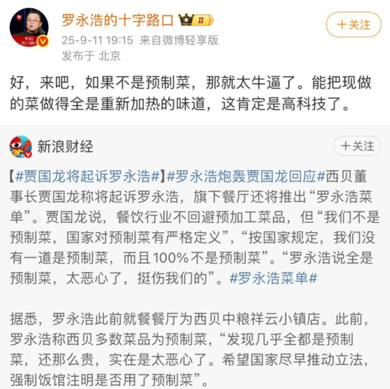 这事起于9月10日下午。罗永浩飞抵北京后与同事相约西贝用餐。饭后他在微博写道:“好久没吃西贝了……发现几乎全是预制菜,还那么贵,实在太恶心了。”他还呼吁“国家尽早立法,强制饭馆注明是否用了预制菜”。