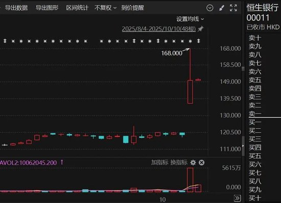 作为港股市场的“蓝筹标杆”,恒生银行的私有化提案堪称年度重磅。10月9日,汇丰控股宣布计划以协议安排方式,作价每股155港元现金私有化其持股约63%的恒生银行,较恒生银行前一交易日收市价溢价约30%,交易总金额约1660亿港元。在这一消息刺激下,恒生银行股价该日收盘上涨25.88%,盘中最高触及168港元,创下2019年以来新高。