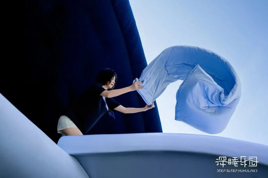 亚朵星球在线下打造的 “深睡乐园”,用蹦蹦床、滑滑梯、拉链小火车、亲肤吊床、海绵迷宫等装置将新产品的核心设计具像化。(左右滑动查看)