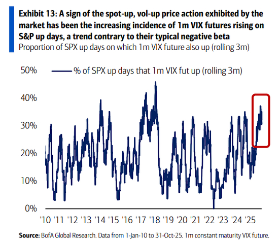 11月5日,据追风交易台消息,美银全球研究(BofA Global Research)在最新研报中称,美股近期频繁出现VIX期货与标普500指数同时上涨的情况,这种“股价上涨、波动率上升”的组合历来是资产泡沫的标志性特征。