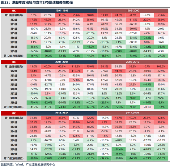 (1)将全部港股公司分为十组,第1组代表EPS增速最大的公司,第10组代表EPS增速最低的公司,里面每一个带颜色的数字,都代表该组公司在该年的涨跌幅中位数。