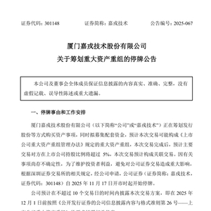 11月17日,嘉戎技术(301148)午间公告称,公司正在筹划以发行股份等方式购买杭州蓝然技术股份有限公司(以下简称“杭州蓝然”)控制权事项,同时拟募集配套资金,预计此次交易可能构成重大资产重组,公司证券已自11月17日开市起停牌。公司预计在不超过10个交易日内披露此次交易方案。