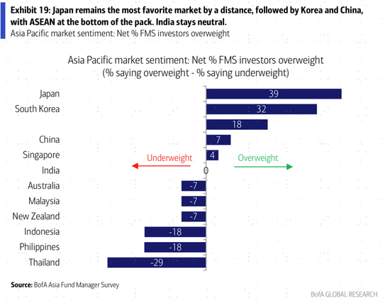 5. 在亚太区域内,看好日本的投资者依然最多(占比从48%降至39%),其次是韩国(从20%升至32%);看好中国从16%降至7%