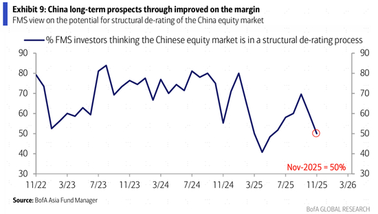 1. 认为中国经济未来12个月走强的人减少到-29%(vs. 10月8%),认为中国正在经历结构性估值下行的比例从10月的60%降至11月的50%